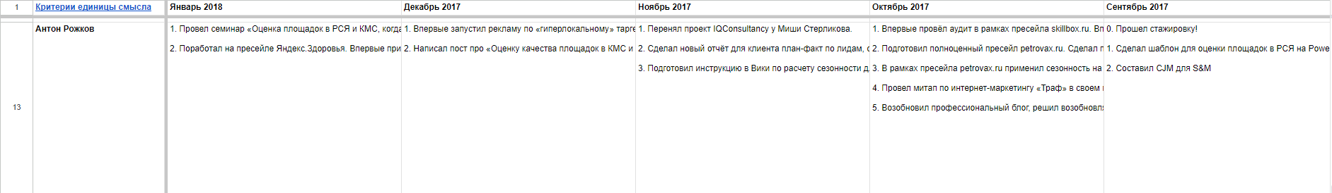 Когда я пришёл в агентство, то записывал свои единицы смысла начиная со стажировки. Вот скриншот, там можно увидеть мои первые записи: