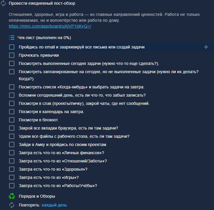 - Добавляю задачи в таск-трекер перед тем как что-то делать. Как только появляется задача записываю в таск-трекер, или в ежедневную заметку, а потом по окончанию встречи в таск-трекер. Если кому-то что-то пообещал → записал, чтоб об этом вспомнить. Включил подписку, за день до окончания задаю себе вопрос, а нужно ли отключать.
